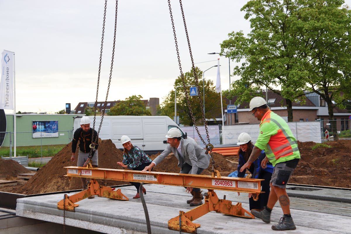 In Boxmeer worden 36 sociale huurappartementen gebouwd. Sanne Donker, directeur Janssen de Jong Bouw Zuid, Bart Kivits, directeur Mooiland en Bouke de Bruin, wethouder, legden een vloerplaat op de fundering. Daarmee is de bouw afgelopen donderdag officieel begonnen. Als alles goed gaat kunnen de bewoners in de zomer van 2024 verhuizen naar hun nieuwe appartement.